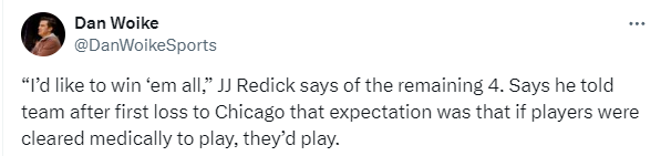 对于球队的目标,雷迪克表示他希望能够赢下赛季剩余的所有四场比赛;雷迪克透露,在首次输给公牛后,他就告诉球队,如果球员确认是健康的,那么他们就会出战。